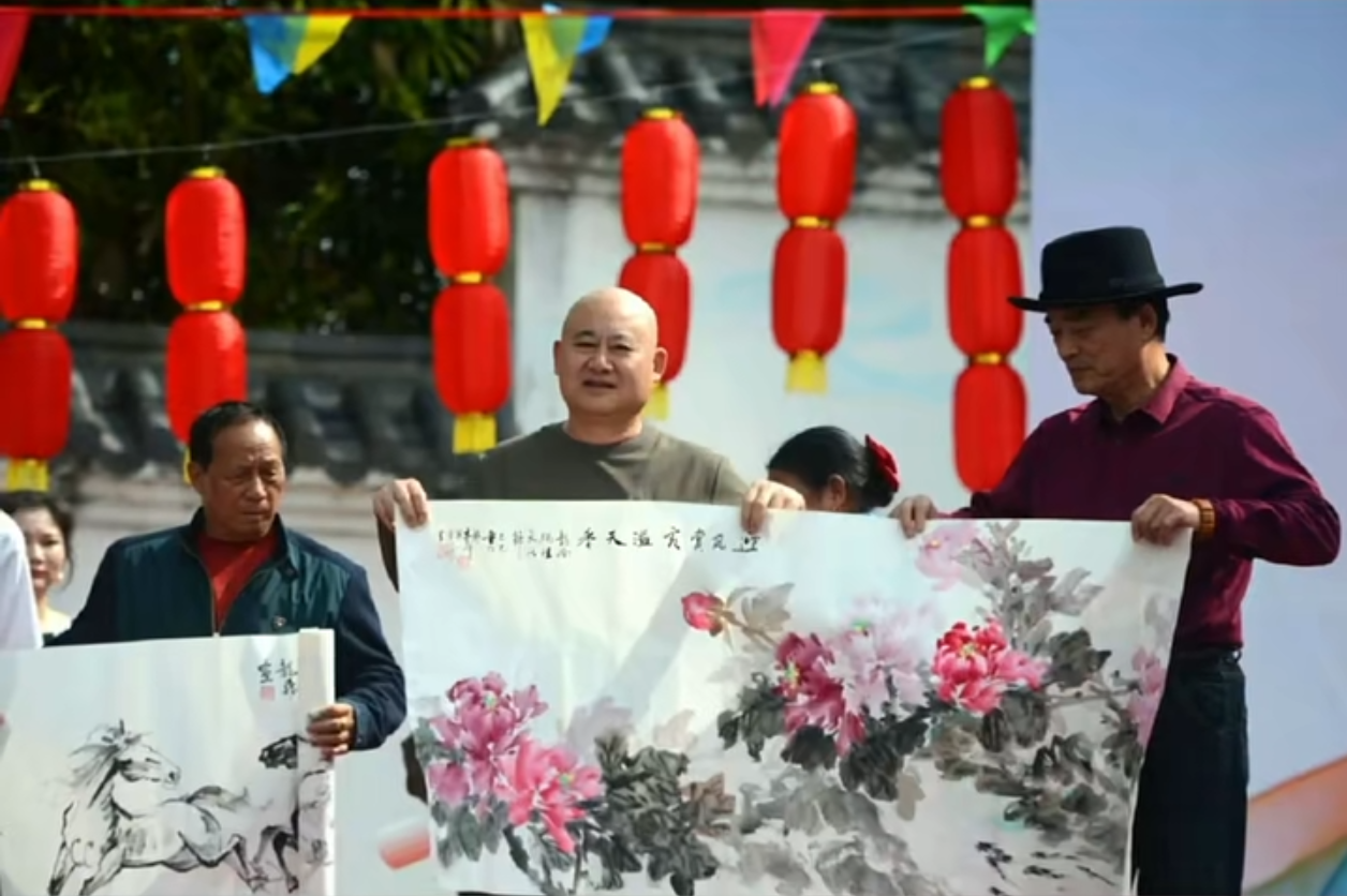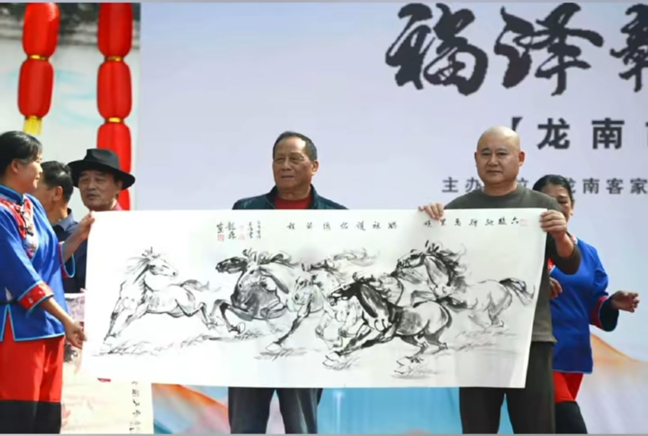 十点整,开幕式的鼓乐声在妈祖文化广场响起,舞龙舞狮的民俗表演热闹非凡,山歌演唱家谢德明老师更献上山歌一曲,清亮婉转的歌声萦绕广场,将客家风情与妈祖文化的交融推向高潮。随后,我们与各位艺术家一同将作品捐赠给龙南客家妈祖文化交流协会收藏,看着作品被郑重接过,心中满是“以艺载道”的满足。